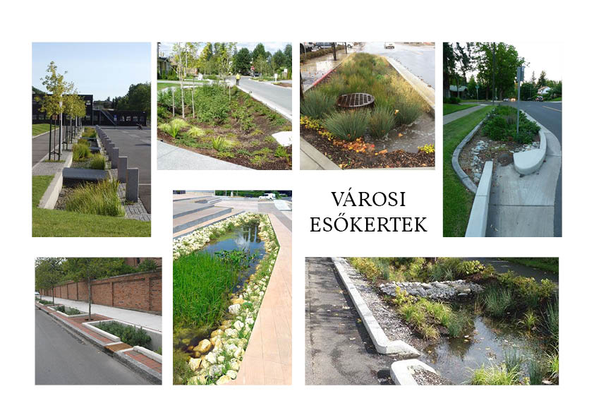 Hozzunk létre a villámárvizeknek leginkább kitett területeken esőkerteket, ahová a csapadékvíz be tud folyni, és helyben hasznosul, egyúttal tisztul is. Az útmenti zöld "zsebekbe" ültessünk olyan növényeket, amelyek jól bírják az időnkénti elárasztást és a köztes száraz időszakokat is. Amennyiben már vannak növények az út közelében, alakítsuk át a padkát úgy, hogy az esővíz bejusson a földjükbe.