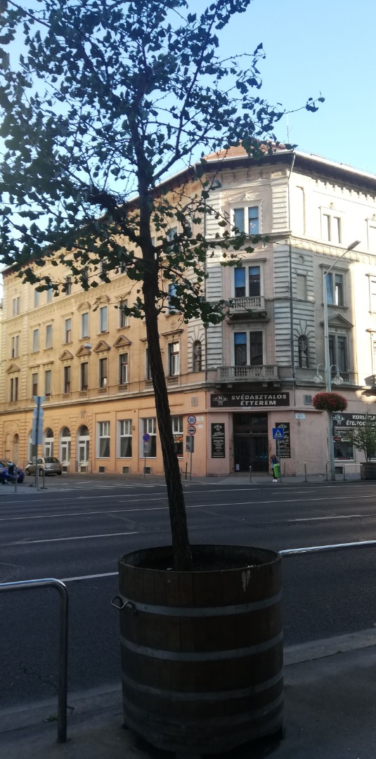 Most a Rákóczi út teljes hosszán néhány konténerben sínylődő fácska és villanyoszlopra telepített muskátlikoszorú adja a növényzetet. Szomorú látvány az embernek, keserves és rövid élet a növényeknek.