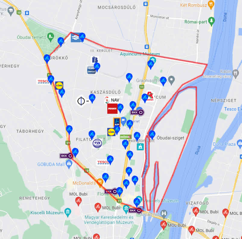 Készítettem egy nagyon felületes és nyilván túlbuzgó térképet a jelzett területekről, az azokon belül található fontosabb csomópontok, intézmények, bevásárló központok megjelölésével és kék színű POI-val jeleztem, hogy hol találom érdemesnek egy bringa állomás telepítését, akár csak 2-3 darab bringa számára is. Aztán természetesen idővel a használati statisztikákból kiderülne, hogy hol van szükség még több ilyen bringára. Azt azopnban biztosan tudom állítani, hogy ezeken a helyeken mindenhol nagy örömmel fogadnák a lehetőséget.