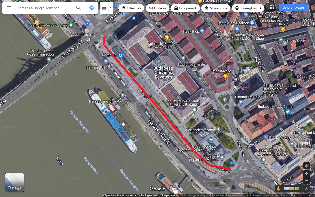 Fővám téren a Corvinus Egyetem mellett a trolibusz útja nyomvonala