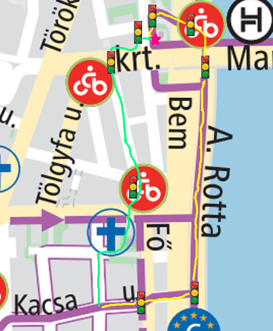 Jelenleg a Margit híd északi oldalán lévő kerékpársáv és a Fő utca / Kacsa utca / Franken Leó útvonal kerékpáros összekötése nem megoldott, a Margit hídról lejőve a gyalogosok között a zebrán tudnak csak átkelni a bicajosok. Sokan nem mernek a Margit körúton kerékpározni, és így a Kacsa utca fele mennek, viszont jelenleg ha bicajúton akarnak közlekedni akkor le kell menniük a rakpartra, aztán onnan vissza: 5 közlekedési lámpát kell végigvárni.