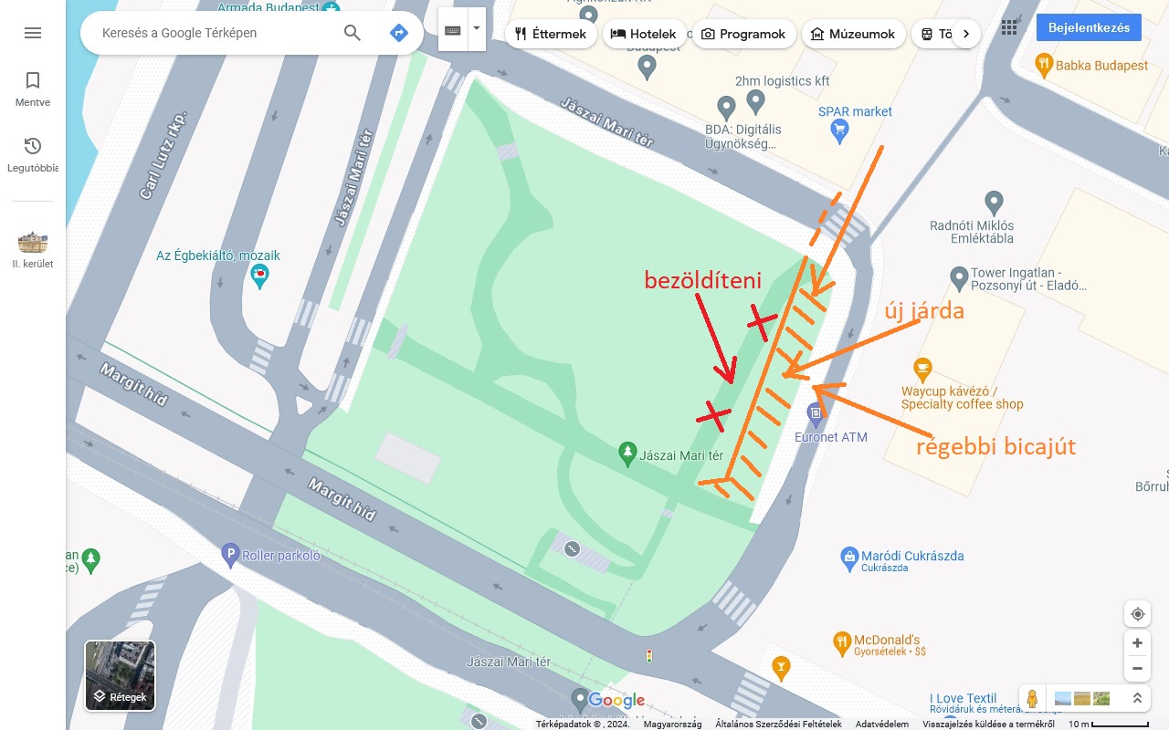 A Jászai Mari tér Margit hídtól Északra eső felén lévő parkban át kéne helyezni és ki kéne szélesíteni a Keleti oldalon futó járdát. Olyan nyomvonalra kéne rakni a park szélére, hogy összekösse a Pozsonyi út Nyugati járdáját a Margit hídéval.