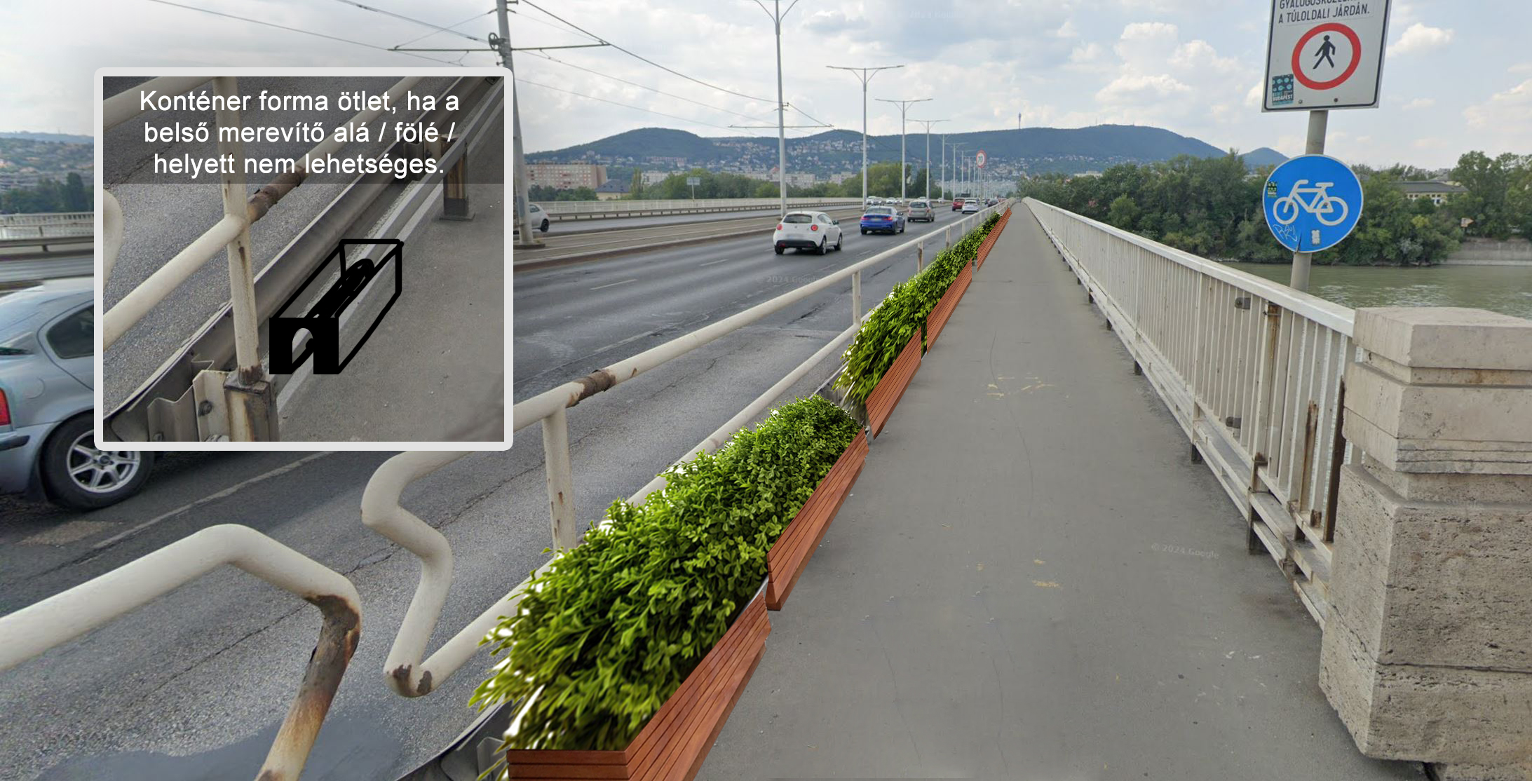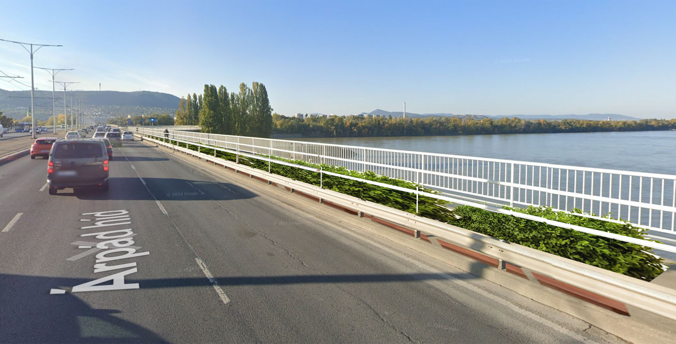 Az elutasítás indoka: Az Árpád híd gyalogos és kerékpáros sávjai eleve szűkek, így bármilyen növénytelepítés – akár növényládákkal is – tovább csökkentené a biztonságos közlekedéshez szükséges teret, különösen a közösen használt szakaszokon. Emellett a híd műszaki adottságai sem teszik lehetővé növényzet elhelyezését, mivel az abból származó szennyeződések (például talaj, levelek) veszélyeztethetik a vízelvezető rendszert. Az ilyen típusú zöldítés kizárólag rendszeres öntözéssel és karbantartással lenne fenntartható, azonban a helyszínen nincs lehetőség öntözőkocsi megállására, így a hosszú távú fenntartás sem biztosítható.