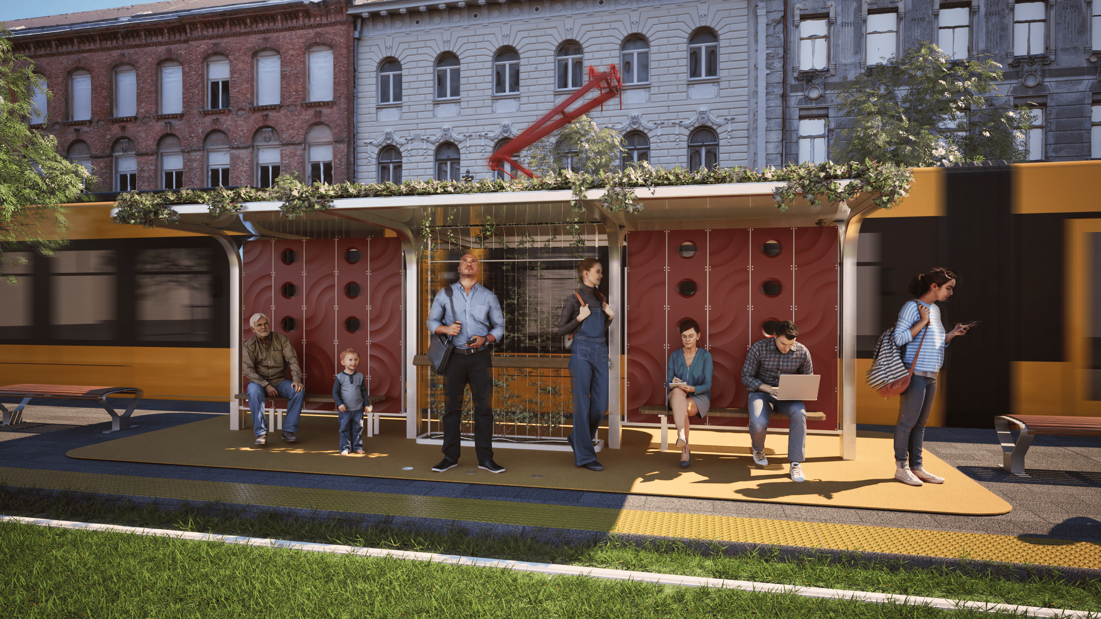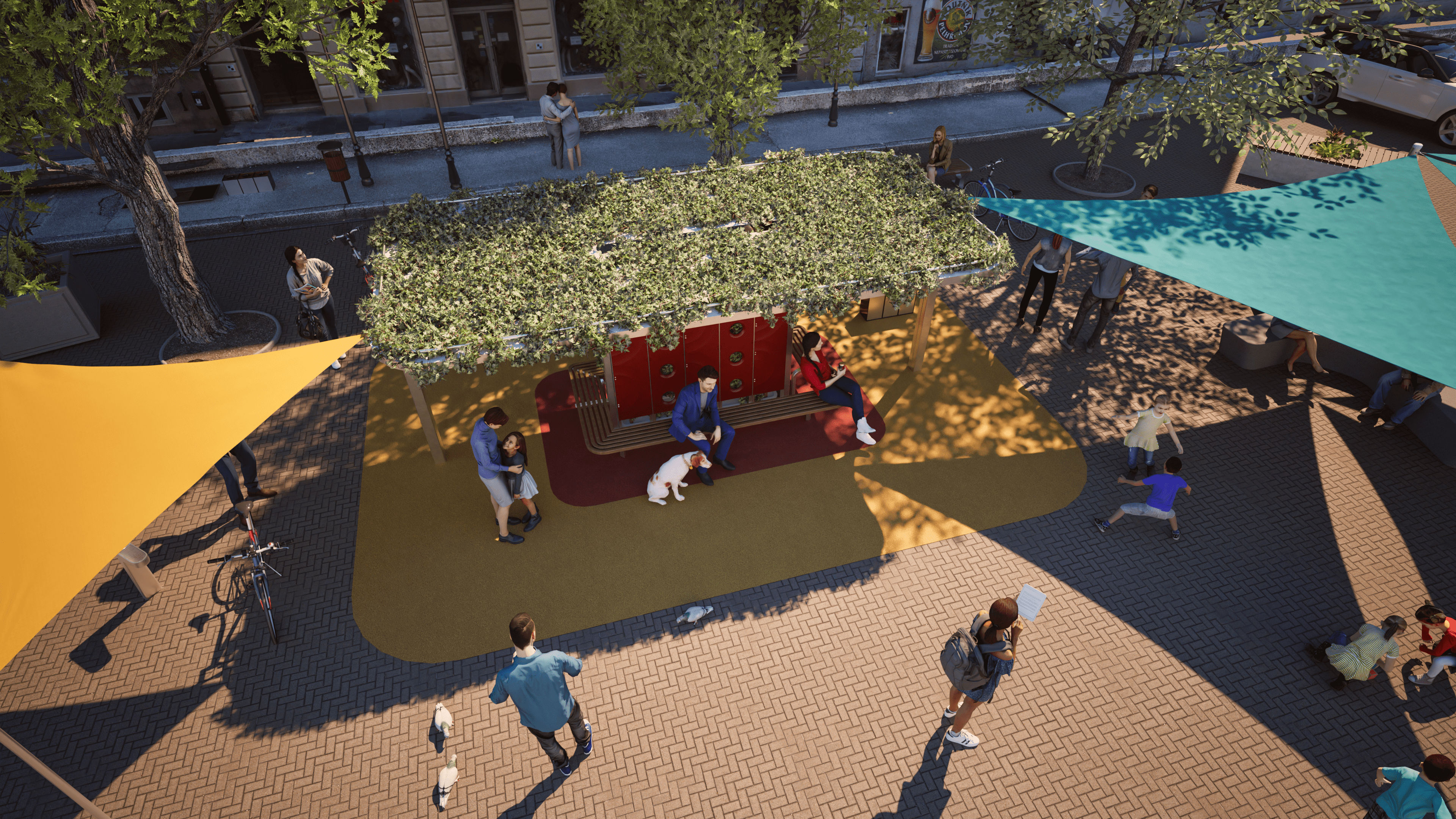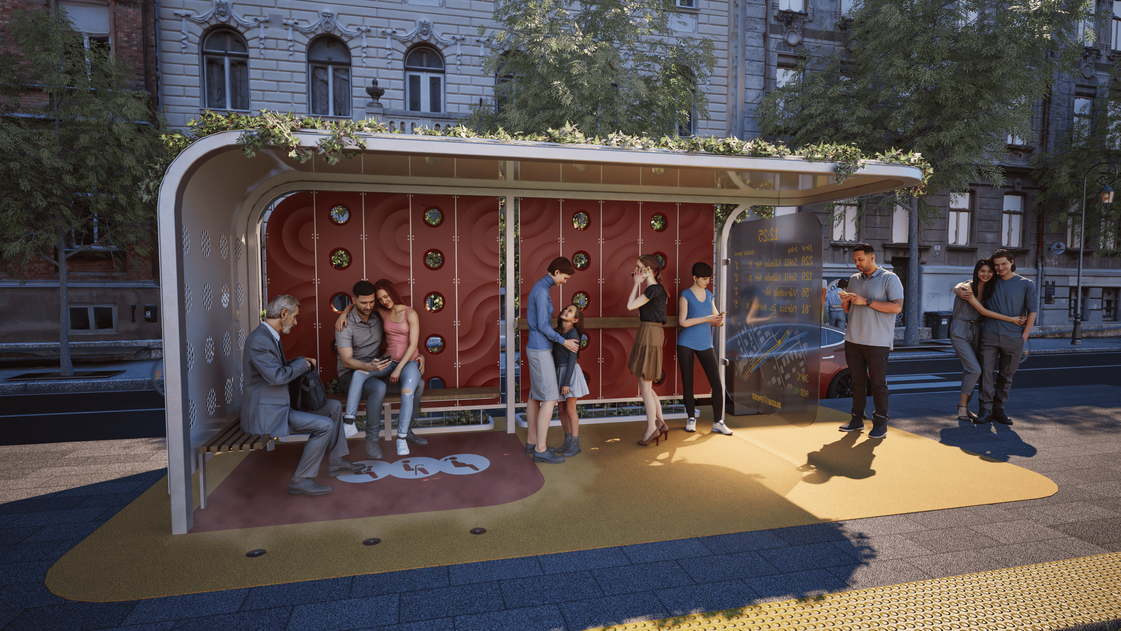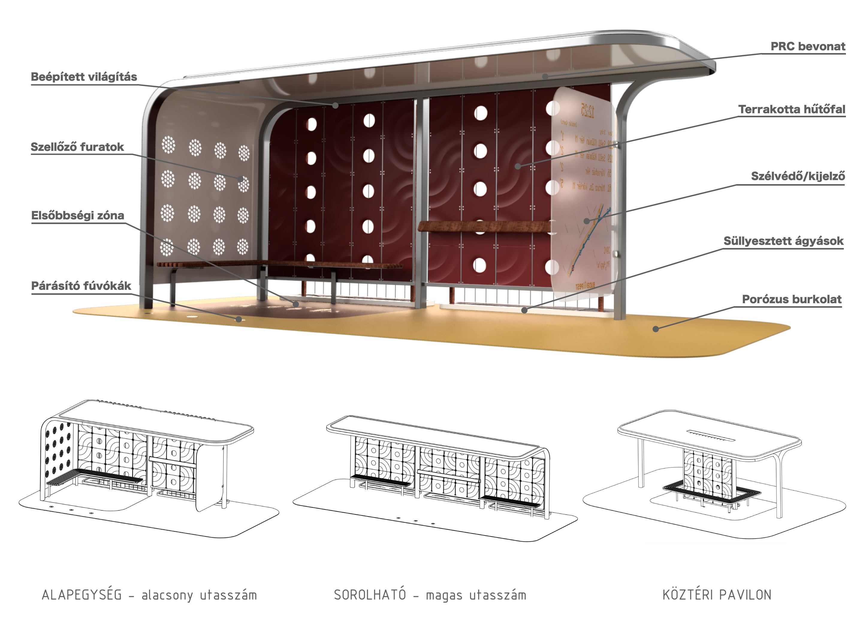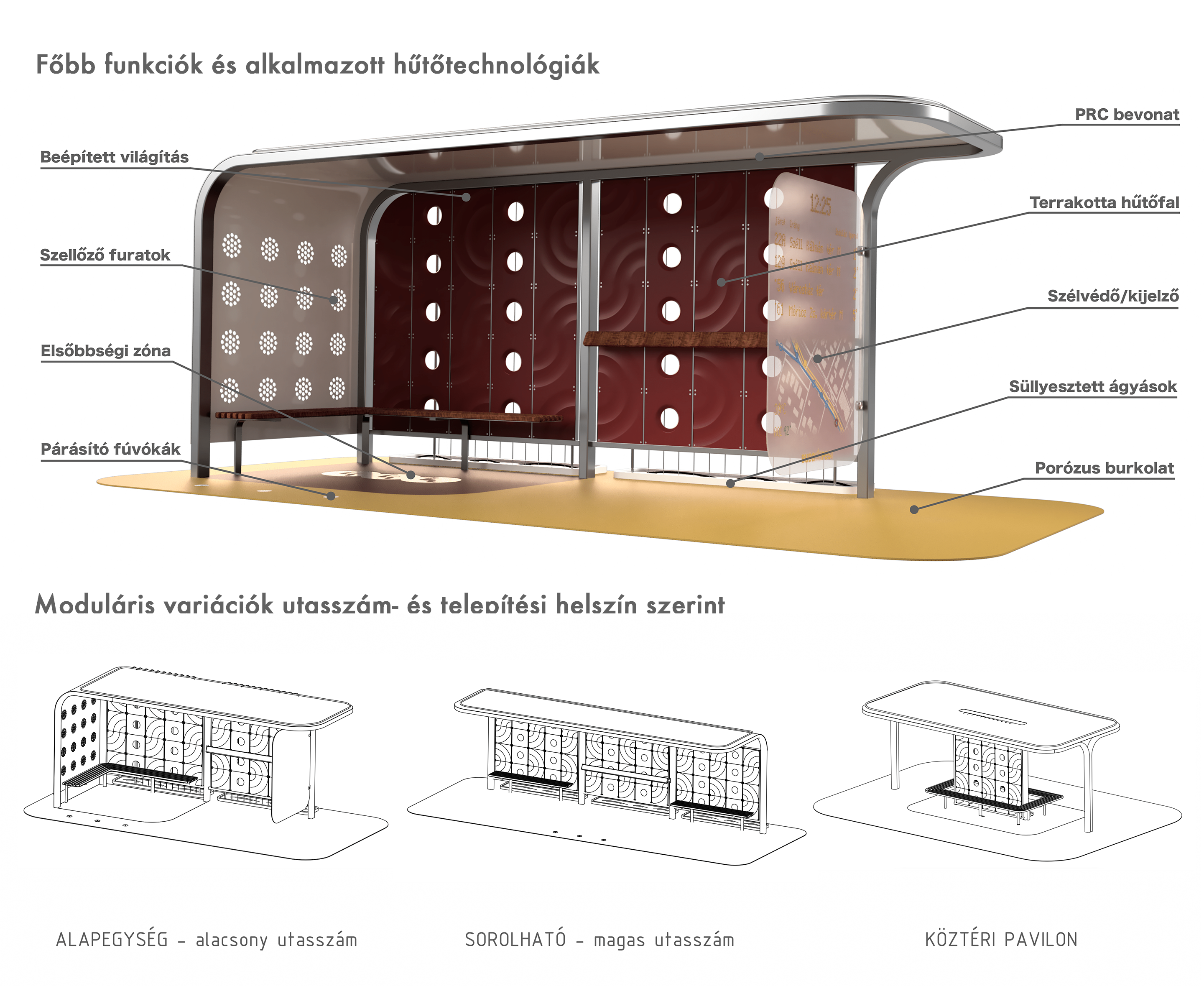A városi hőszigethatás miatt a sűrűn beépített területek jelentősen melegebbek lehetnek a külvárosoknál, ami a nyári hőhullámokkal együtt súlyos egészségügyi kockázatokat jelent. Ötletem egy moduláris pavilonrendszer, amely természetes hűtési megoldásokkal csökkenti a városi hőterhelést. A szerkezet visszaverő PRC bevonatot, árnyékolást és párologtatásos hűtést biztosít - víztakarékos nagynyomású párásító rendszerekkel és növényzettel. A burkolat alatt az esővizet geotextíliával bélelt gyűjtőtérben tárolja, így a villámárvizek ellen is bevethető. A pavilonok nemcsak buszmegállók lehetnek, hanem pihenőhelyek, mikromobilitási csomópontok is, kerékpártárolókkal. Az főváros telepíthetné ezeket a hőszigetek által leginkább érintett területekre, hozzájárulva a városi klíma javításához és az ott élők komfortérzetéhez, a korábbi "hűsítő szigetek" folytatásaként, de azoknál jóval hatékonyabban.