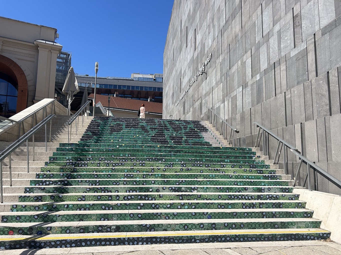 Jó érzést kelt és szebbé teszi a lakókörnyezetünket, lásd design lépcső Bécsben: Museum Moderner Kunst bejárata előtt.