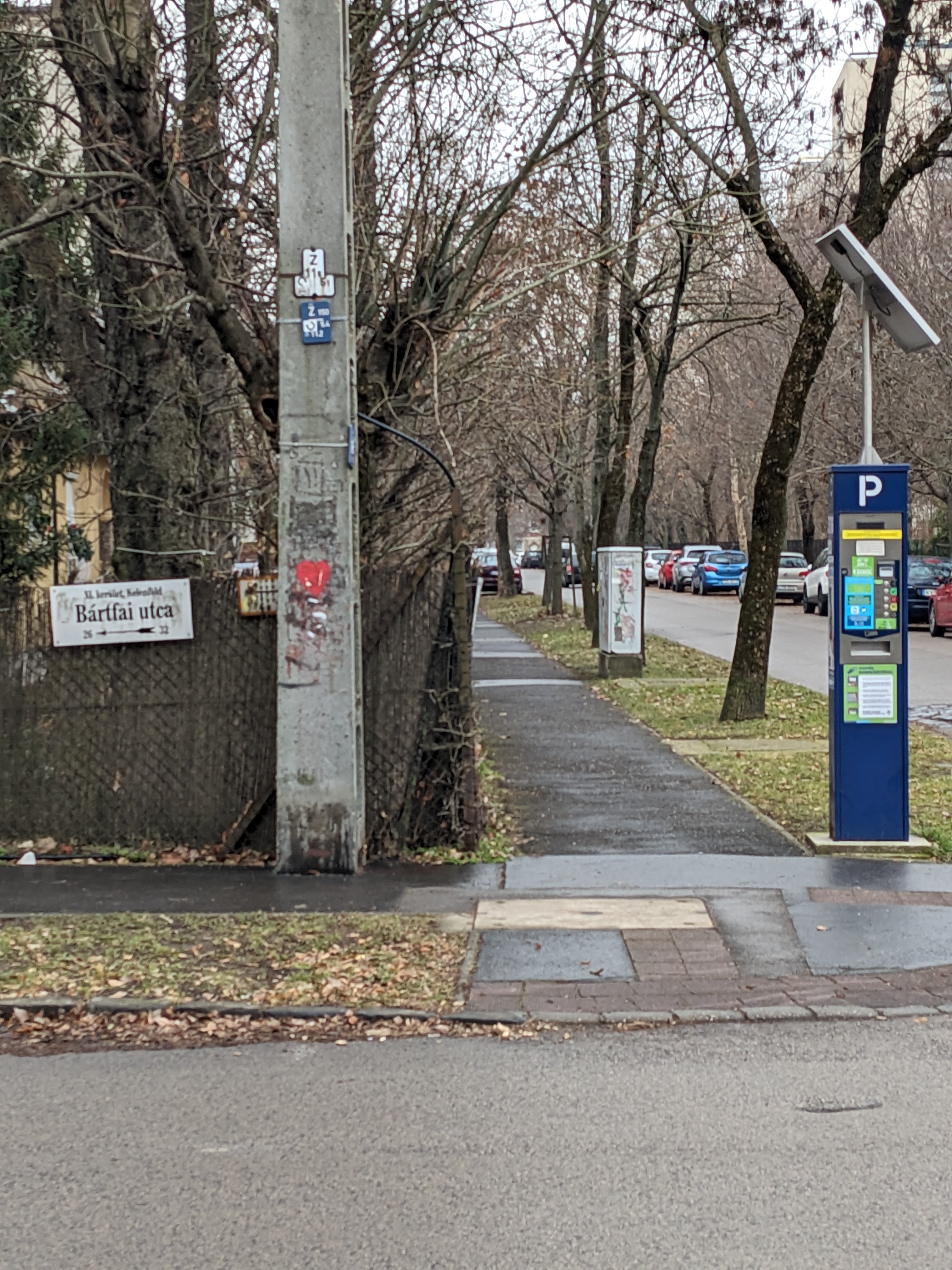 Nagy szükség lenne egy biztonságos gyalogos átkelőhelyre ezen a sarkon, mert sokan megyünk itt át kisgyerekekkel az óvodába, játszótérre és hiába jobbkezesek az utcák, az autók nem állnak meg és még gyorsan is mennek. A Bártfain a Tétényi útnál, kb. 400 méterre van a legközelebbi zebra, a másik végen a Fehérvári útnál szintén több száz méter távolságban.