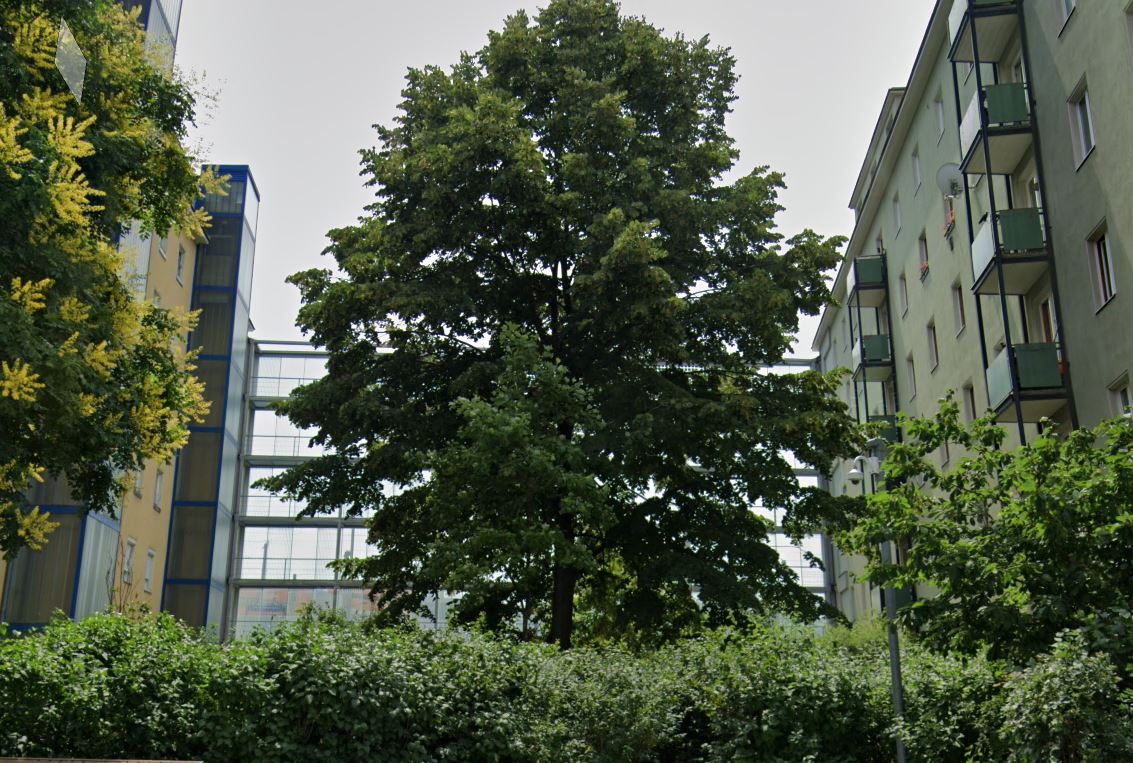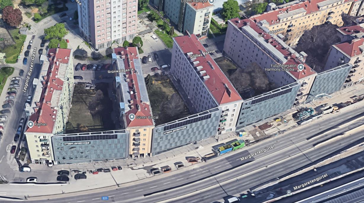 Pozitív példa: Bécs, Margaretengürtel: transzparens zajvédő falak a Grünwaldgasse sávházai között. A zajvédő falak mögött csendes pihenőkertek jöttek létre. A megoldás esztétikus.