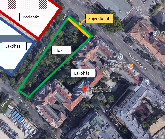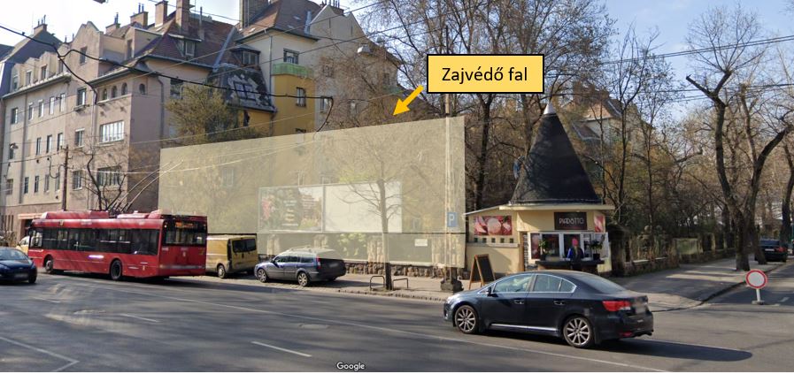 Egy esztétikus zajvédő fal nemcsak az előkert pihenőkertként való használatát szolgálná, hanem a környező lakóházak Dózsa György forgalmából adódó zajterhelését is jelentősen csökkentené. Továbbá, javítaná a jelenlegi utcaképet, ahol jelenleg két óriásplakát foglal helyet.