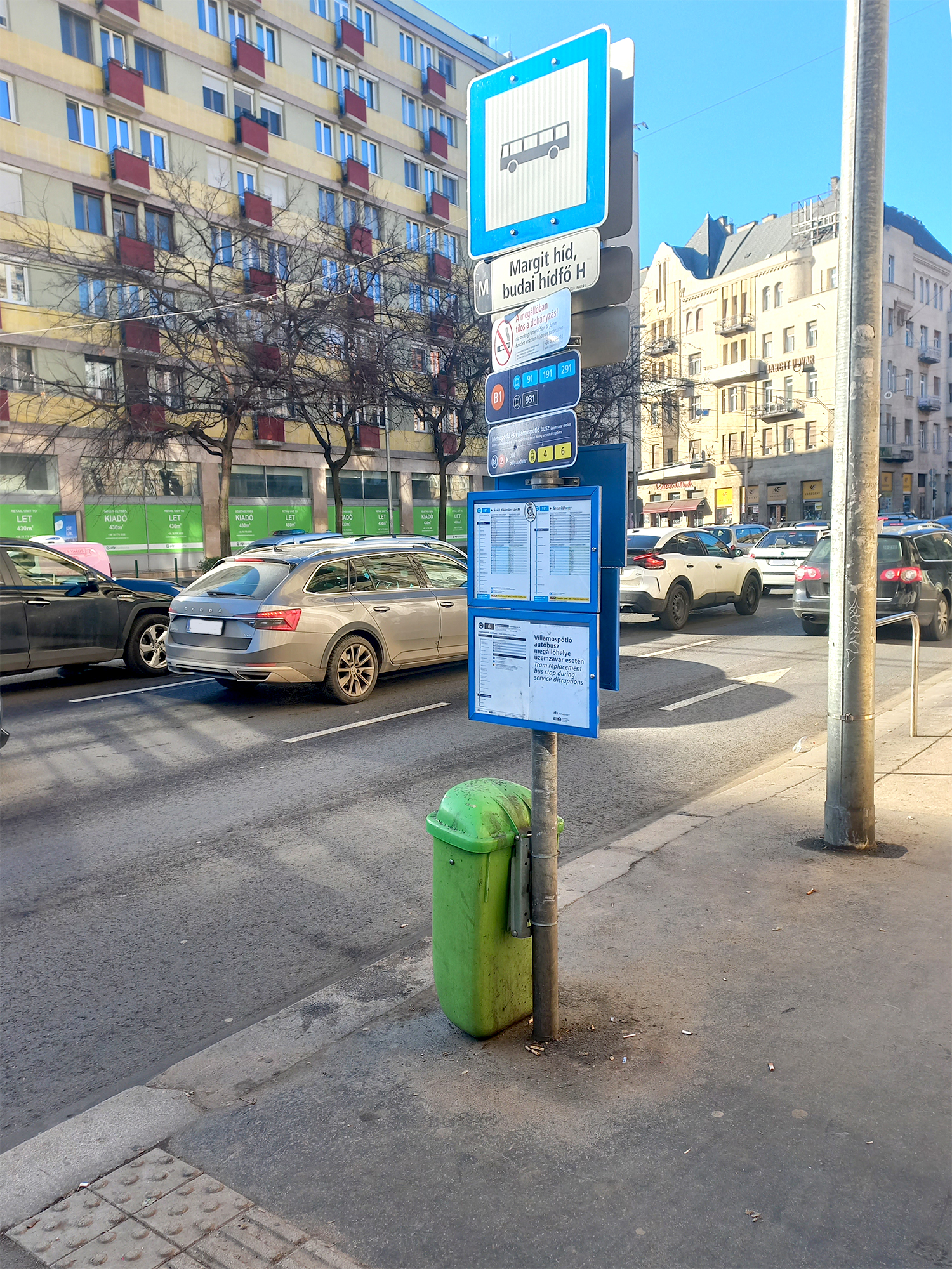 A Margit híd budai hídfőjénél lévő buszmegállóhoz a meleg hónapokban kora délelőttől késő délutánig odatűz a nap. Eső esetén a szomszédos üzletek előtetői alá és a kapualjakba lehet csak behúzódni, de sok várakozónak gyakran nem jut hely. Ülve várakozni csak a gyrosos által kihelyezett két széken van lehetőség.
