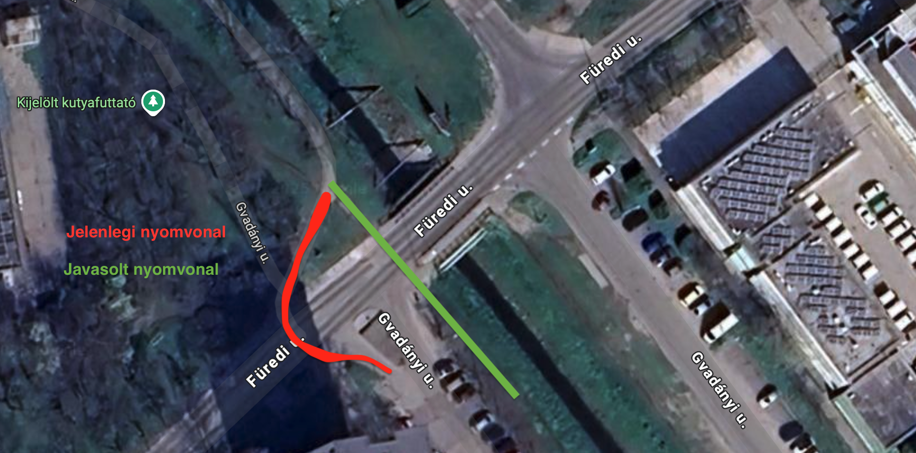 Ez a fejlesztés hivatalossá tenné a jelenlegi gyakorlatot. A legtöbb biciklis ezt a kanyart levágja és a padkákon át, az úttesten szabálytalanul átkelve folytatja tovább útját a patak töltésén lévő járdán. Hiszen ez a logikus nyomvonal. A nyomvonal módosításával biztonságossá és egyszerűbbé válna az átkelés ebben a kereszteződésben.