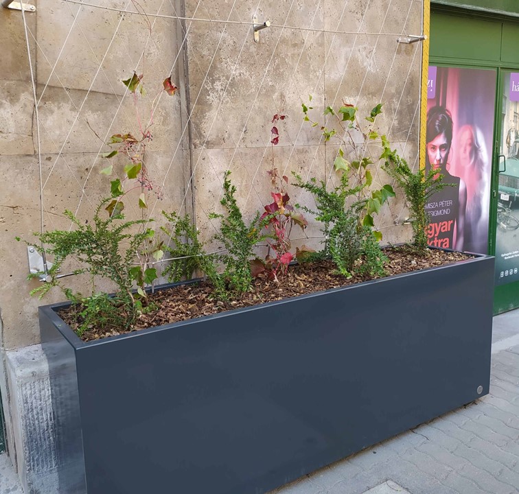 Elkészült a Pesti úti társasház zöldhomlokzata Az október végén átadásra került Pesti úti homlokzatzöldítéssel együtt összesen három helyszínen valósult meg a közösségi költségvetés „Zöldfalak a belvárosban” nyertes ötlete, ezzel a projekt megvalósítása lezárult. Ezen a harmadik helyszínen a panelház két oldalán közvetlenül talajba ültetett vadszőlők mellett a homlokzat vonalában változatos, várostűrő évelőkiültetés is növeli a zöldfelületet. A növényzet az épületre rögzített acél sodronyokra kapaszkodva tudja a majd a homlokzatot befutni, 1-2 éven belül számottevő új zöldfelülettel gazdagítva a környezetét. A növényzet fenntartásáról – a megkötött együttműködési megállapodás értelmében – a pályázó társasház gondoskodik a továbbiakban.